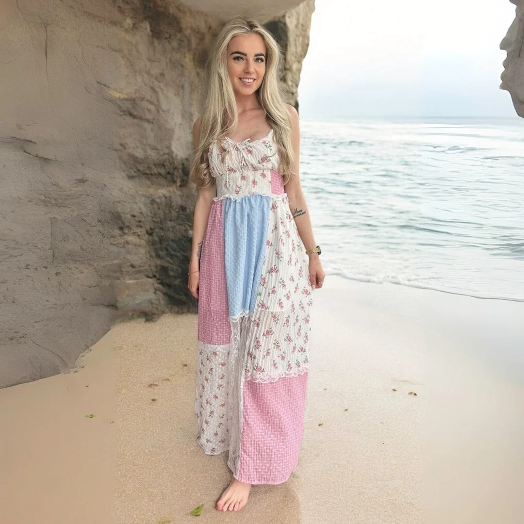 The Belle Wild Rose Patchwork Dress combines vintage charm with a modern boho twist. Its mix of floral prints and delicate lace creates a unique patchwork pattern, showcasing femininity with a flowing silhouette. The halter neckline and backless design add allure, perfect for sunny occasions.