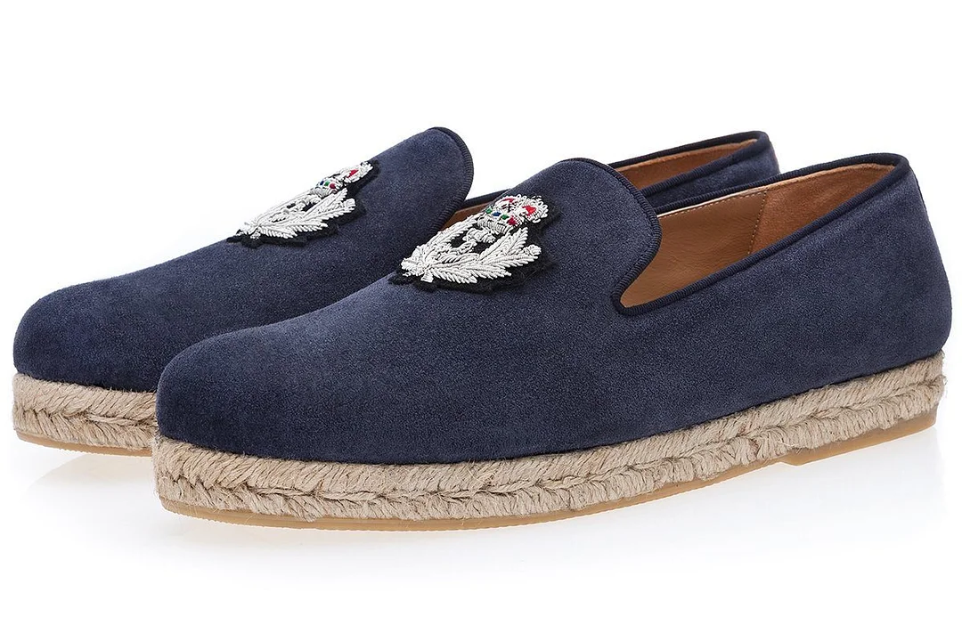 Navy blue suede espadrilles with Royal-inspired bullion embroidered patches. Handcrafted in Vigevano, Italy, with calfskin lining and Alpargatas® rope and rubber soles.