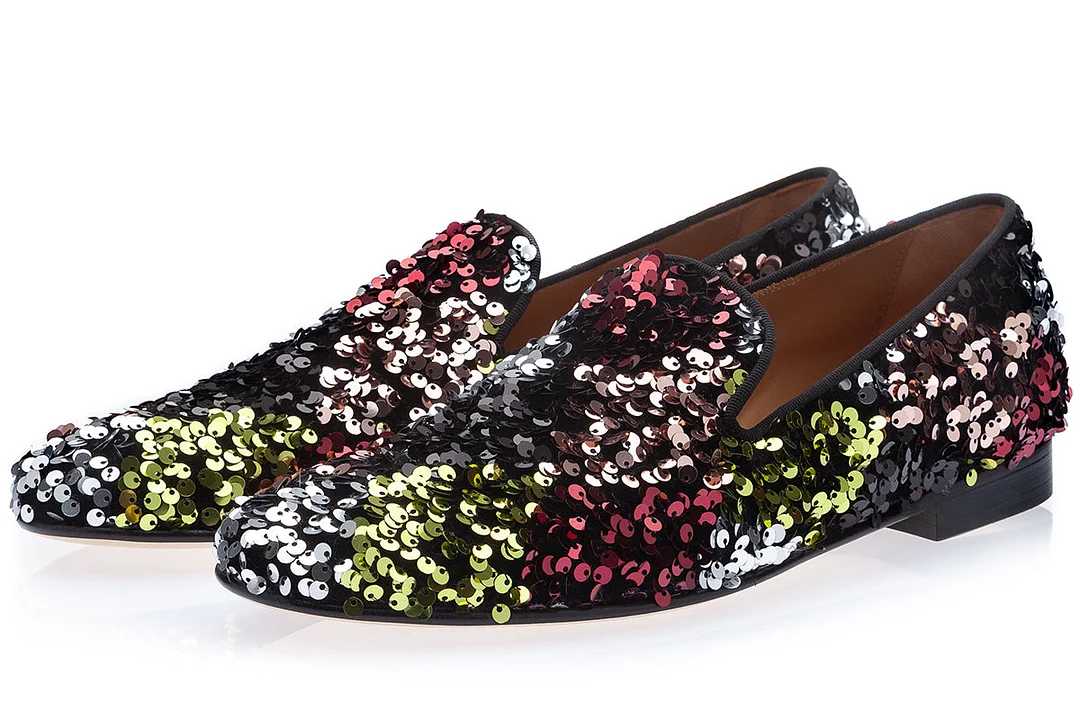 Multicolored sequined canvas slippers with black gros-grain piping. Handcrafted in Vigevano, Italy, according to the traditional "a sacchetto" technique with calfskin lining and leather soles.