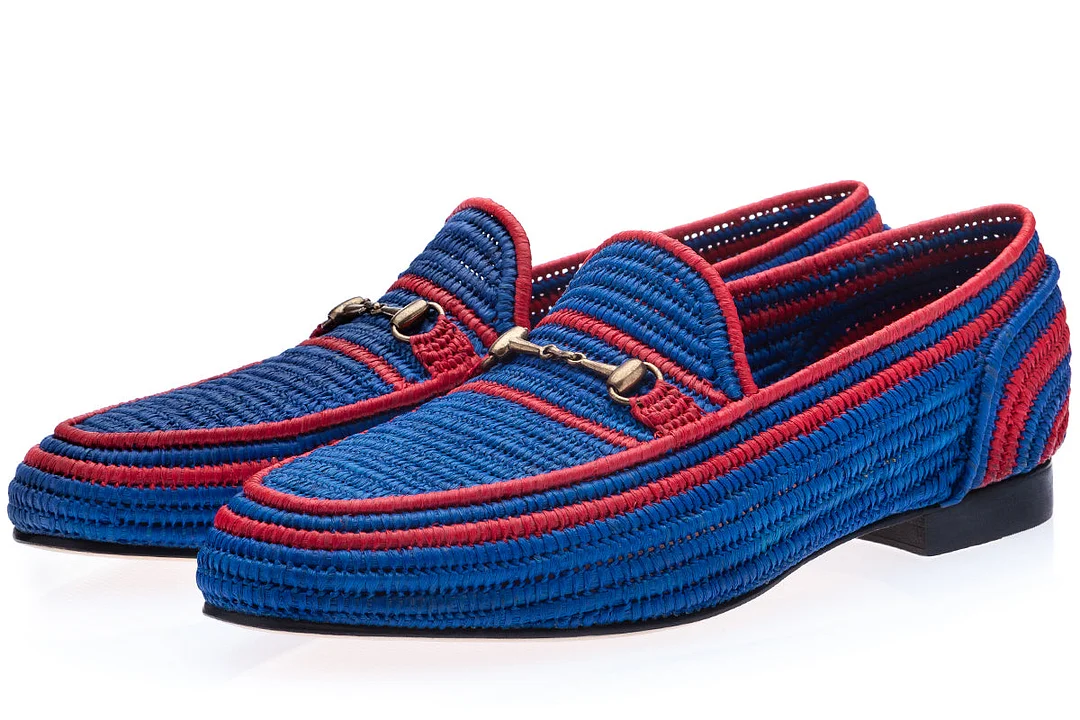 Royal blue and red striped natural raffia loafers with metal horsebits in antique gold finishing. This style is fully unlined for maximum lightness and each pair takes at least a day to make. Handcrafted in Essaouira, a port city on the Atlantic coast of Morocco, according to the traditional moroccan raffia weaving techniques with calfskin insoles and leather soles.