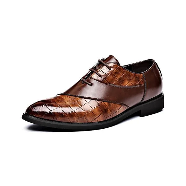 Men's spliced business formal shoes are elegantly designed footwear crafted specifically for formal and professional environments. The term "spliced" refers to the seamless integration of different materials or textures, often leather panels of varying shades or textures, creating a sophisticated and cohesive design. These shoes feature classic silhouettes with a slightly more open lace-up design (like derbys), making them suitable for formal business attire. They prioritize a clean and understated aesthetic, often incorporating subtle design elements such as stitching or perforations for ventilation while maintaining comfort through cushioned insoles and supportive outsoles. Available in timeless colors such as black, brown, men's spliced business formal shoes are versatile options ideal for professionals seeking stylish footwear for formal meetings and office settings.