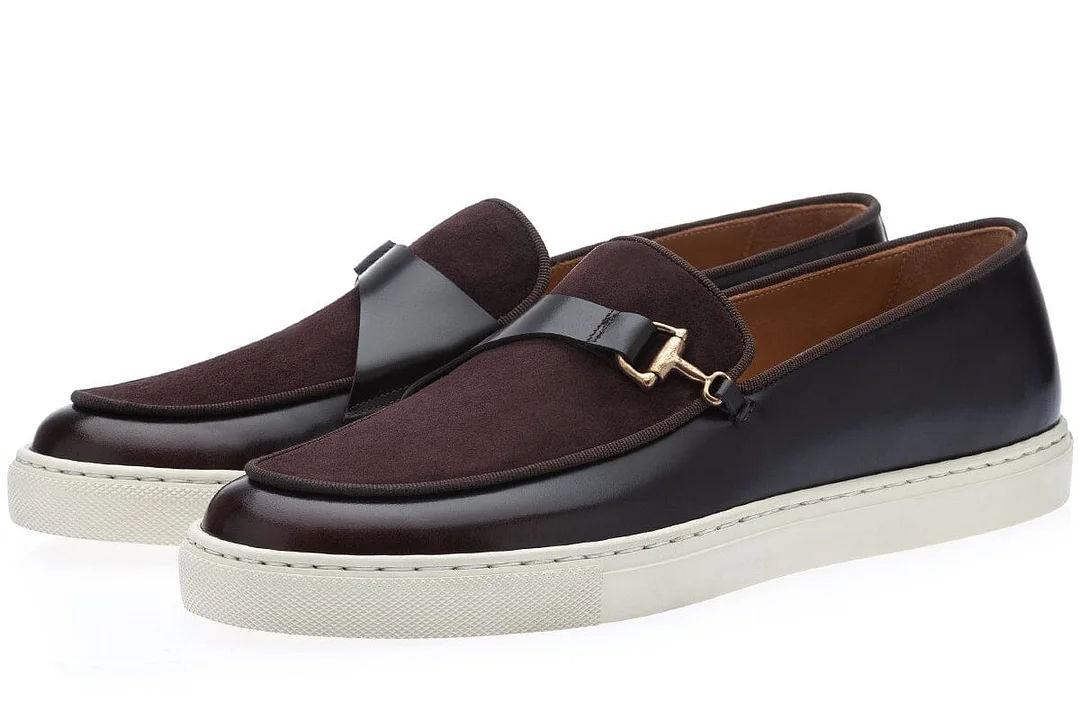 Dark brown hand-polished calfskin Belgian style slip-on sneakers with matching suede inserts, ton-sur-ton gros-grain piping and metal equestrian-inspired embellishments in antique gold finishing. The matte patination of the leather is hand-removed with quick machine brushing and gives the shoe a unique glossy-matte effect. Handcrafted in Vigevano, Italy, with calfskin lining and cream-colored Margom® rubber soles.