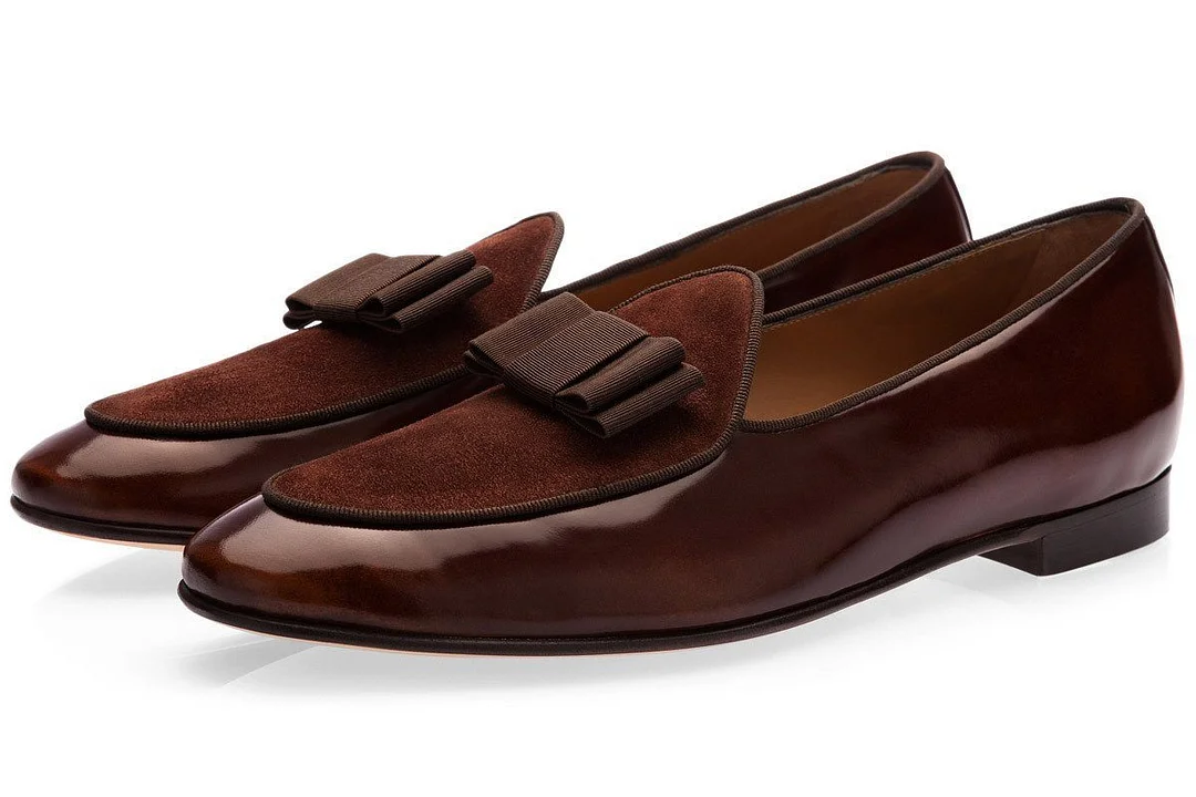 Dark brown hand-polished calfskin Belgian loafers with ton-sur-ton suede inserts, gros-grain piping and detachable clip bows. Handcrafted in Vigevano, Italy, according to the traditional "a sacchetto" technique with calfskin lining and leather soles.