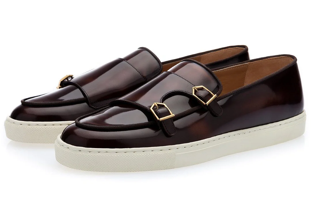 Dark brown hand-polished calfskin Belgian style double-monk slip-on sneakers with ton-sur-ton gros-grain piping and golden metal buckles. Handcrafted in Vigevano, Italy, with calfskin lining and cream-colored Margom® rubber soles.