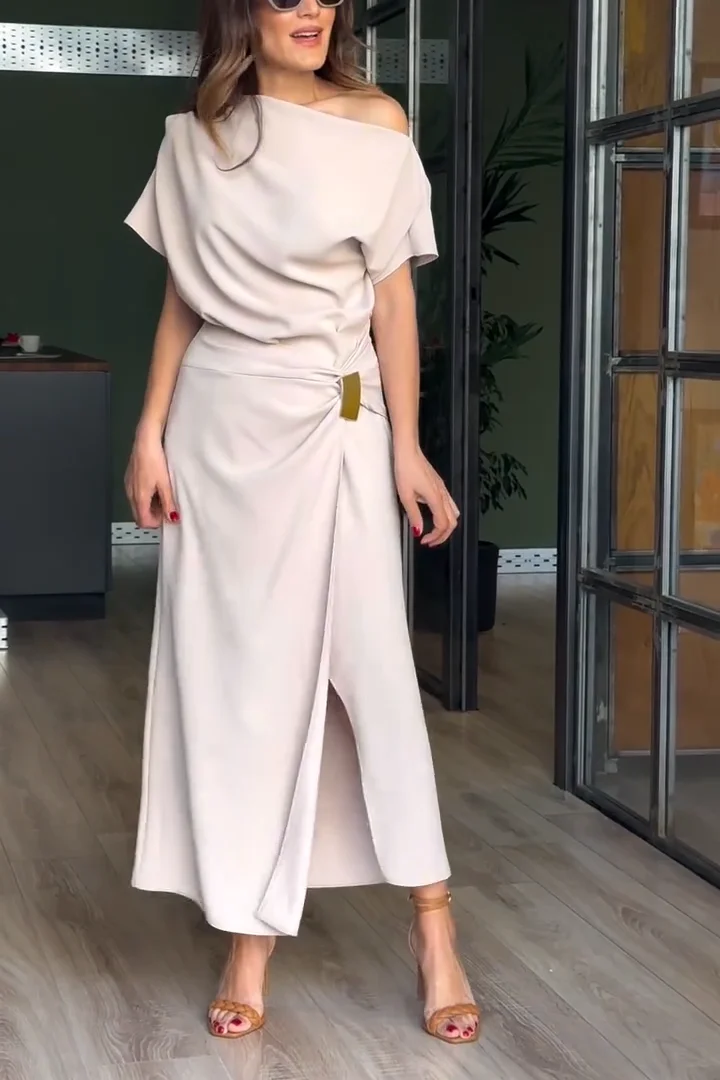 Women's Elegant Solid Color Off-shoulder Slant Neck Short Sleeve Dress