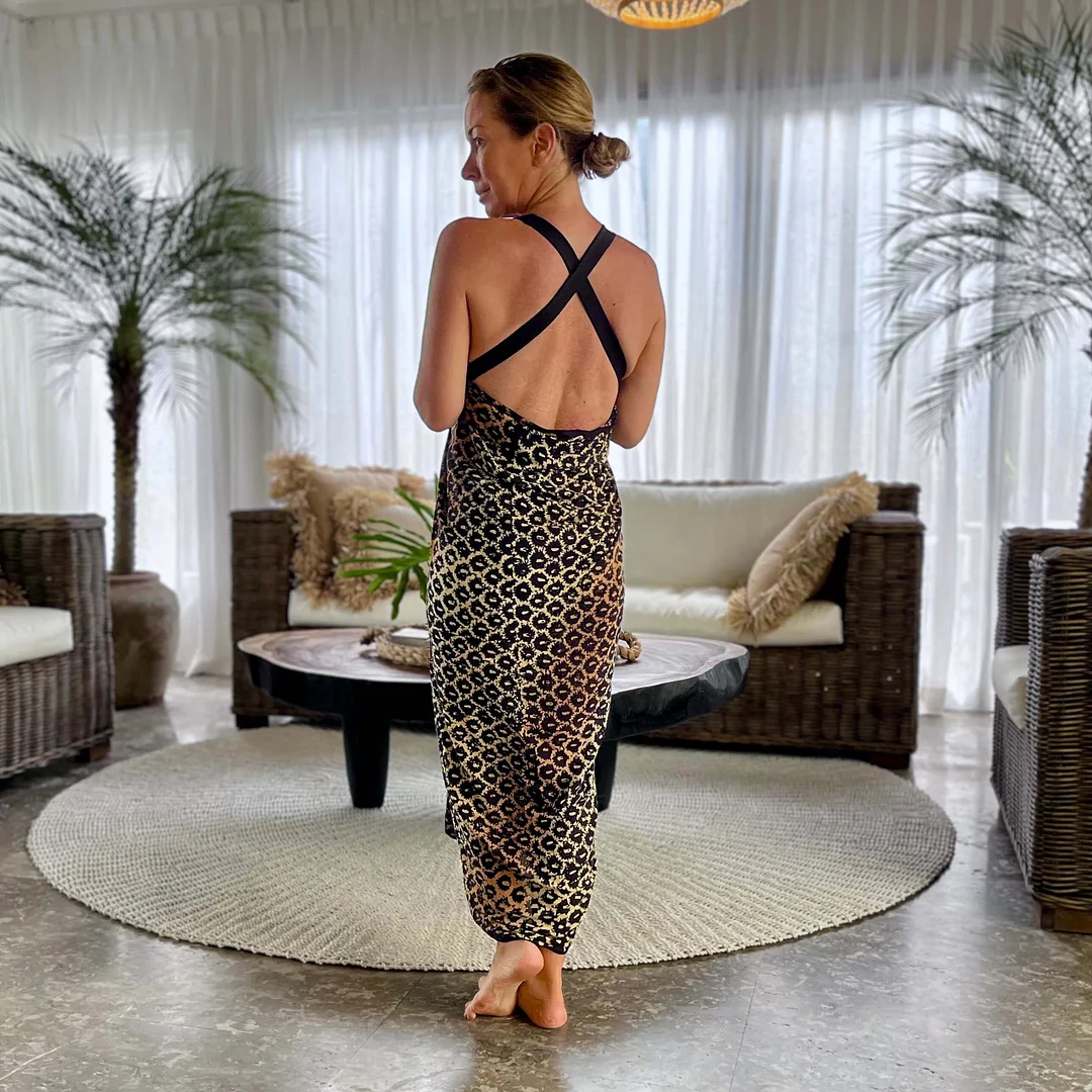 Introducing our versatile and stylish women's beach sarong in a chic and earthy combination of bronze, browns, and black.